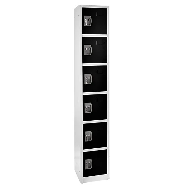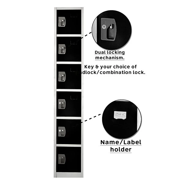 The AdirOffice Steel Six Compartment Tier Key Lock Storage Locker will also be warmly welcomed in school corridors, golf clubs, sports franchises, public safety, first responder and similar organizations where secure storage for participants is essential. AdirOffice storage lockers keep clutter off the floor and secure items within. The storage locker includes 6-shelved compartments and 6-hooks to store items. This is a 6 tier compartment storage locker. Assembly required with provided hardware. Each door has 2-keys and option for user-provided combo- or padlock-enhanced security. The AdirOffice locker also contains a slot for names or numbers for personal or public use extends locker utility.