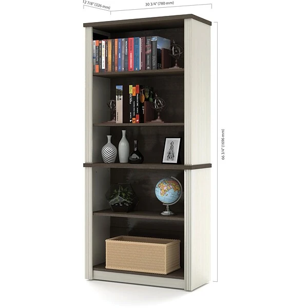 - The bookcase has five shelves, three of which are adjustable and is modular.