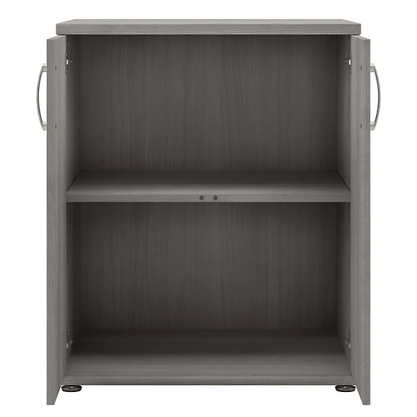 The Bush Business Furniture Universal floor storage cabinet with doors and shelves features a commercial quality design and contemporary styling that suits virtually any home or professional environment. Organize your office, break room, garage, laundry room, or another work or living space with an accent cabinet that’s built to last and boasts plenty of practical storage capacity. Cabinet doors with smooth Euro-style hinges open to reveal one fixed shelf and one adjustable shelf that accommodate office supplies, books, tools, and household items of various sizes. Each shelf supports up to 50 lbs., so storing larger materials is no problem. The floor cabinet’s base includes adjustable levelers to compensate for uneven surfaces. This two-door storage cabinet has been tested to meet ANSI/BIFMA quality standards for safety and performance and is backed by a 10-year manufacturer warranty.