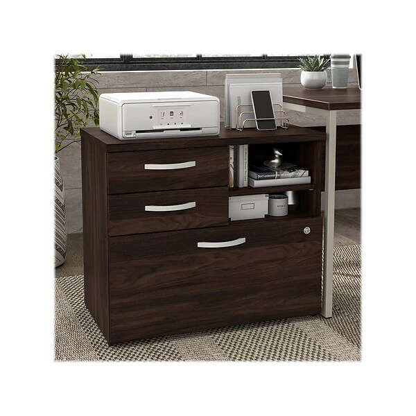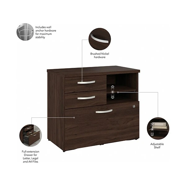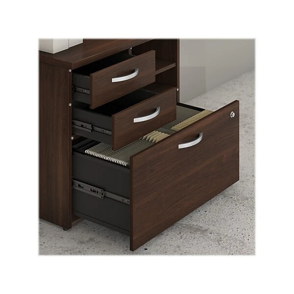 The Bush Business Furniture Hybrid office storage cabinet with drawers and shelves offers a stylish, long-lasting workplace organization solution for the modern professional. Keep important documents, office supplies, work in progress, and equipment in order, so you can access the materials you need quickly and easily. A file drawer opens on smooth full-extension ball bearing slides for an effortless reach to letter-, legal-, and A4-size paperwork and can be locked to protect sensitive information. Two box drawers organize writing utensils, notepads, and other supplies, while the open shelves are ideal for frequently used items. The file storage cabinet’s stable design and included wall attachment hardware make it a safe choice for use in virtually any home or professional office environment. Find the perfect look for your space with five contemporary finish options: black walnut, modern hickory, platinum gray, storm gray, and white. This lateral file cabinet with shelves has been meticulously tested to meet or exceed ANSI/BIFMA quality standards for safety, durability, and performance and is backed by the Bush Business Furniture 10-year manufacturer warranty. See the full Bush Business Furniture Hybrid collection for coordinating items to enhance your workspace as needed, including computer desks, bookcases, and storage cabinets (coordinating items sold separately). American-made with US and imported parts.