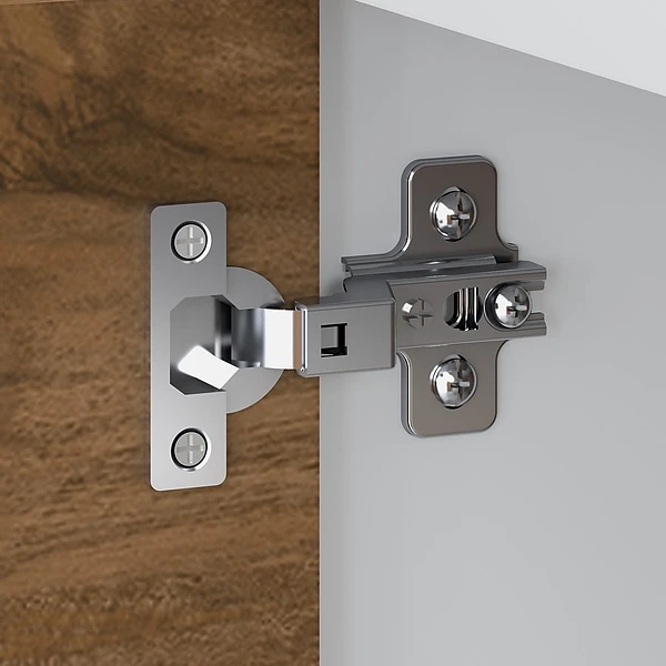 - Cabinet doors boast linear brushed satin nickel handles and open on smooth Euro-style hinges