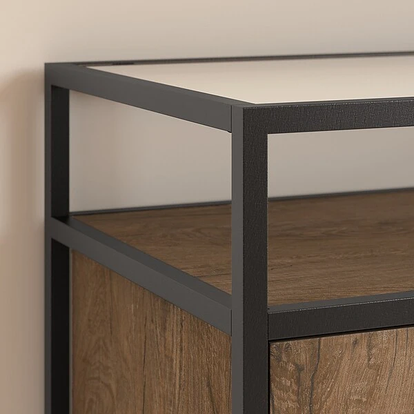 The Bush Furniture Anthropology Small Storage Cabinet with Doors provides a versatile home organization solution with an adaptable industrial modern design. A durable metal frame supports the rustic 2 door cabinet while a raised glass surface adds room for display and allows the top to function as a record player stand. The cabinet features an adjustable shelf for flexible storage and Euro style hinges that allow the doors to open and close smoothly. The glass top supports up to 25 pounds and includes a safety film. A 5 inch space beneath the glass surface allows the top of the cabinet to be used for storage and display of books, magazines, records and more. This home organizer is tested to meet ANSI/SOHO standards for safety and performance and is backed by a 1 year warranty. See the full line of Anthropology products for more urban industrial style home furnishings.