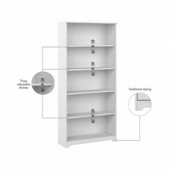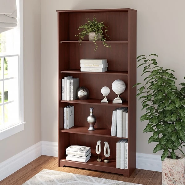 This attractive Bush Furniture Cabot 5 Shelf Bookcase is perfect for the home office or anywhere storage is needed. Its slender profile and 5 shelf design mix style with function at a great value. Use on its own or group a few together for a complete storage wall design. When outfitting an office use this Bookcase next to the Cabot Desk with Hutch combination (sold separately) for a seamless look as they match in height. The sophisticated, stable design has two fixed shelves for structural strength while three adjustable shelves let you customize so all of your items are sure to fit. The bookshelf lets you easily stow books, binders, decorative bins, accents and more. Meets ANSI/SOHO test standards for safety and performance. A stylish and timeless design with rich finish complements any environment. See the full collection for coordinating items. Backed by a 1 Year Warranty.