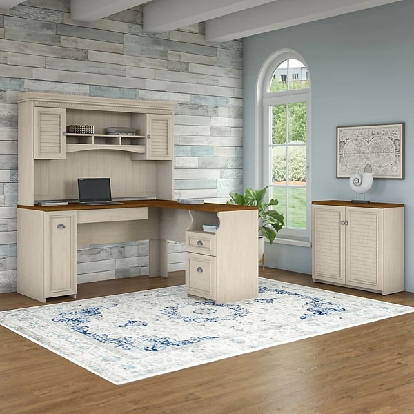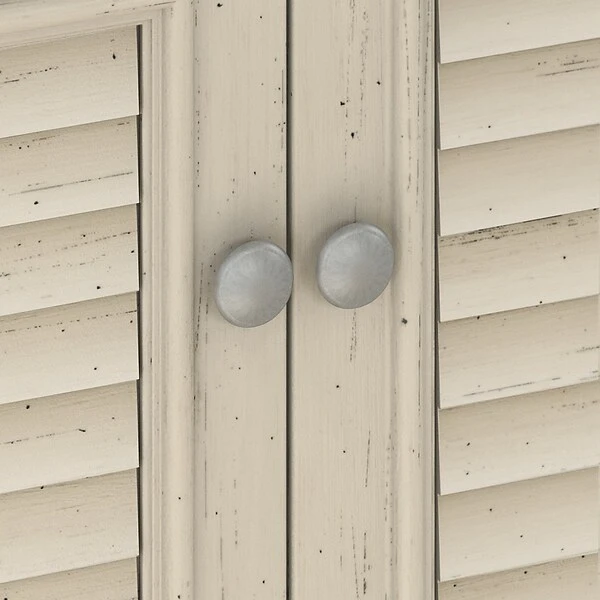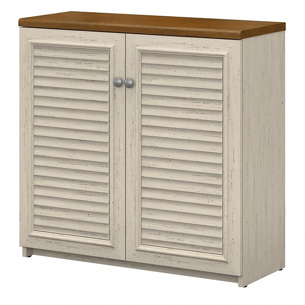 With its practical design and casual appearance, the Bush Furniture Fairview Small Storage Cabinet with Doors offers a versatile solution to organizing your home. A slightly weathered finish with Antique Pewter hardware invokes the welcoming charm of modern farmhouse style, while a durable build and functional features ensure long lasting appeal. The low profile design works well in small spaces while still providing ample storage, making this accent cabinet a good fit for any room. Elegant louvered doors on Euro style hinges open to reveal 3 shelves, 2 of which can be adjusted to hold items of different sizes. The top of the 2 door Storage Cabinet offers a sturdy surface with enough space to display your favorite trinkets and mementos. This organizer has been tested to meet ANSI/SOHO standards for safety and performance and is backed by the Bush Furniture 6 Year Manufacturer’s Warranty.