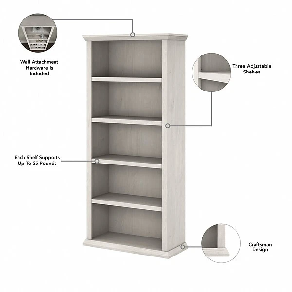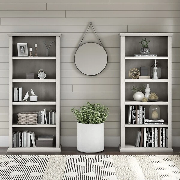 The Bush Furniture Yorktown tall five-shelf bookcase set of two presents a stylish and practical solution for organizing any work or living space. Use the matching bookcases to showcase your personal library or brighten up the room with pictures and home decor. Both bookcases include three adjustable shelves that move up and down to accommodate items of various sizes and two shelves that are fixed for stability. Each shelf supports up to 25 lbs., so you can store a collection of hardcover books and display larger decorations with confidence. Wall attachment hardware is included for family-friendly safety and security. Bush Furniture Yorktown’s classic charm is highlighted by stylish beveled edge detailing and comes in linen white oak finish. This tall bookcase set is tested to meet ANSI/SOHO standards for safety and performance and is backed by a 1-year manufacturer warranty.