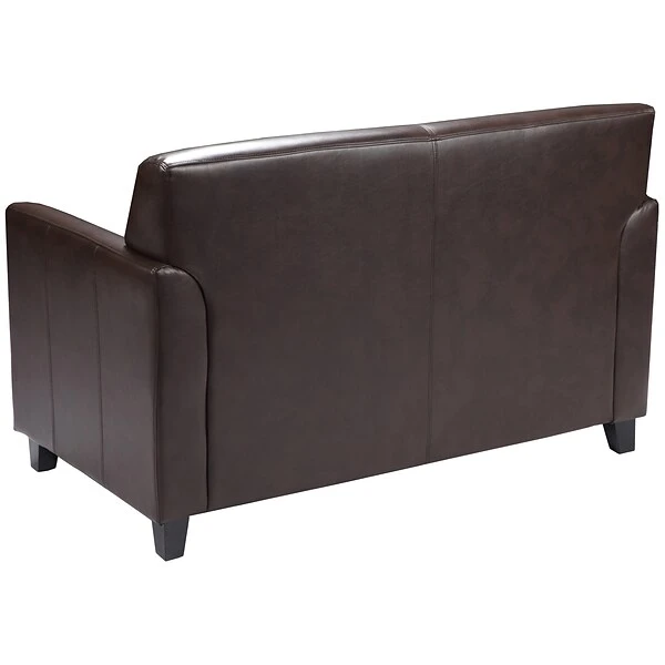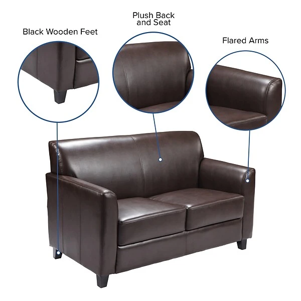 Not only does this loveseat feature comfortable cushions, flared arms and raised feet, the hardwood construction frame will give you many years of use. The raised block feet look great and make it easier to clean the flooring beneath. This reception loveseat is perfect for the office as well as waiting room seating. The contemporary design of this furniture adapts in several different settings. This upholstered loveseat will not only fit in a professional environment, but will add a modern look to your home.