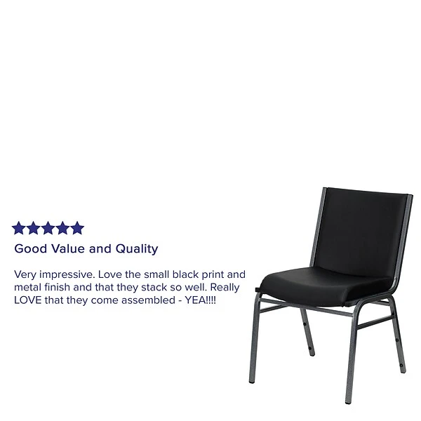 When you need comfortable seating, these padded stack chairs offer versatility to be used in myriad environments. Utilize this multipurpose side chair in the church, office, classroom, training room or in the home. This stacking side chair can create uniform, row seating with the included ganging bracket. Add flexible reception chairs in your lobby to keep guests comfortable as they await to be seen or use as a side office chair for meetings. Built for durability, the heavy duty frame with bumper guards prevent the finish on the frame from being scratched when stacked. To make transporting even easier, equip yourself with the appropriately sized stack chair dolly. So, when in need of temporary or permanent seating, this multi-purpose stack chair is sure to meet the needs of any venue.