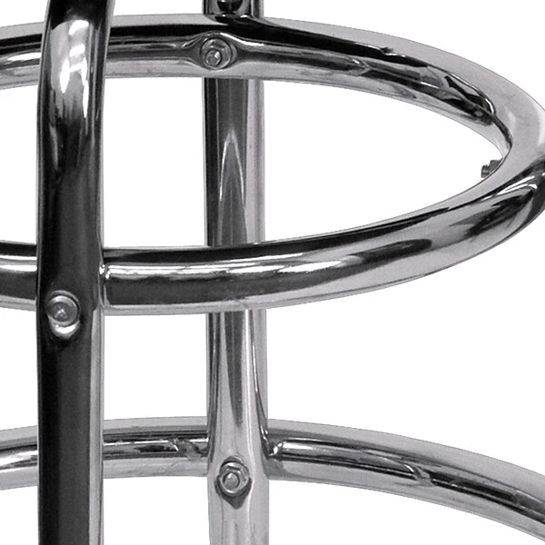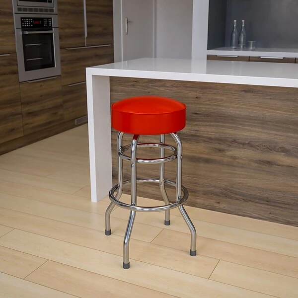 Treat the patrons of your bar, restaurant or pool hall to this superbly designed double ring barstool. The round swivel seat provides easy access and promotes conversation between customers. This commercial grade stool was built to withstand the daily rigors in the hospitality industry, but is still stylish enough for home use. The tubular footrest not only supports your feet, but acts as an additional reinforcement that helps secure the legs. This stool is also easy to clean, upholstered in a durable red vinyl cover. Add this comfortable bar height stool to your kitchen island, pub style dining table or home bar for family and friends to enjoy.
