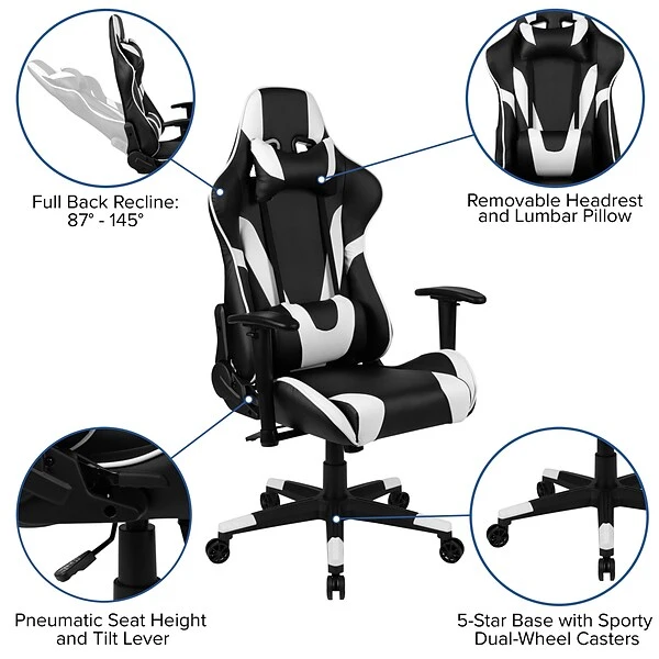 Have game day any time on your PC or console when you own this racing gaming chair. Featuring a reclining back, this high back ergonomic office chair offers key support while sitting for extended periods. Adjustable headrest and lumbar pillows can be repositioned or quickly unsnap for removal. Adjustable pivot arms relieve pressure from your neck and shoulders as well as the upper body. Gamers need ergonomic chairs that’ll keep them comfortable for many hours and this reclining office gaming chair will provide optimal support. Whether you need to lean back a little or a lot there’s a separate lever to recline the back 87° ~ 145° while the lever underneath the seat controls the seat height and locks the chair in an upright position. Complete your gaming experience with our red or black gaming ergonomic desk with cup holder and headphone hook.