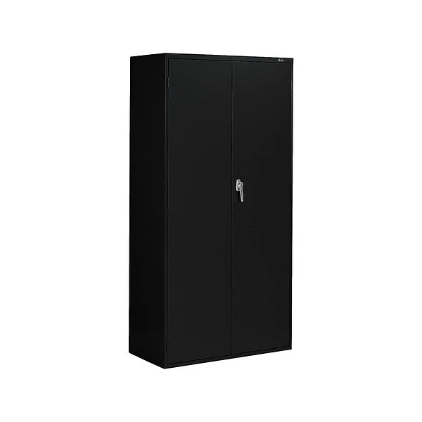 Lock expensive equipment inside this metal storage cabinet. It has three adjustable shelves and one fixed shelf, so you can customize it to your storage needs, and the built-in lock lets you secure items to prevent theft. It is 72 inches tall to save floor space, and the black finish imparts a sleek look. This Global 9300 steel storage cabinet is welded for durability.