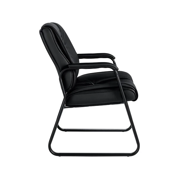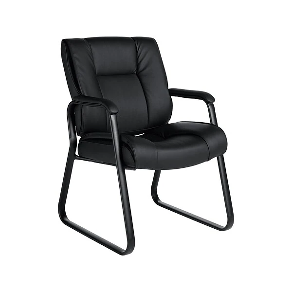 Give visitors to your building a comfortable seating option with this guest chair. The rich luxhide upholstery offers a rich, inviting texture, and the contoured padded seats deliver added comfort throughout extended waits. A sled-style base provides stability on a range of flooring surfaces. This black reception chair features fixed padded arms to define personal space in group seating areas. The sleek silhouette and mock leather trim coordinate seamlessly with a wide range of contemporary office decor themes for a cohesive appearance. Boasting a sturdy construction, this Offices To Go guest chair stands up to heavy use for long-lasting durability.