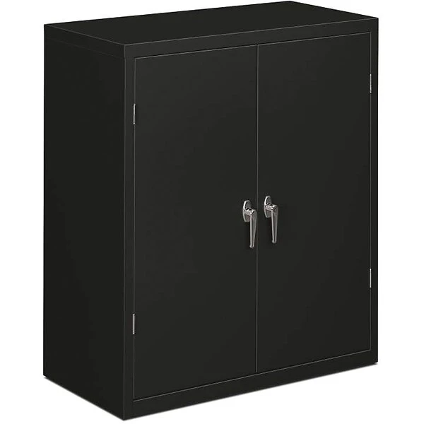 HON® Brigade® 3-Shelf assembled storage cabinet in black color features three-point locking system that secures doors on top, bottom, side. Cabinet has satin chrome double handles that helps to secure multiple doors/drawers.