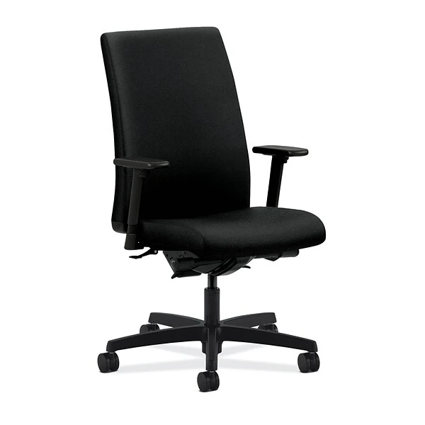 Ignition seating from HON fits your body, your work and your space. This mid-back chair with synchro-tilt and independent back angle offers an exceptional range of motion and is excellent for time-intensive activities. Its high recycled content reduces wood waste. Warranted for users up to 300 lbs. Height- and width-adjustable arms are standard for added comfort. Seat and back upholstery color is Black, and frame and base color is Black.