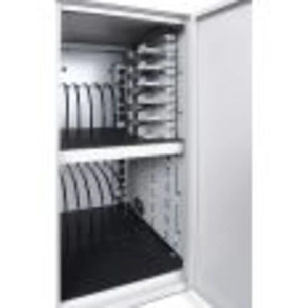 - Charges, stores and transports up to 12 tablets or Chromebooks (6 per shelf)