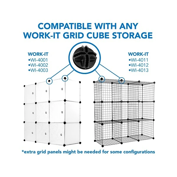 Extra set of storage connectors for the cube storage models offered by Work-It! The connector is easy to utilize and will help you create multiple types of cube storage variations.