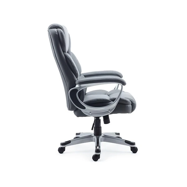 Create a plush seating configuration with this Mcallum managers chair. The soft bonded leather upholstery adds an inviting texture and high-end look for your executive office. With its high-back design, built-in lumbar support and contoured cushions, this chair provides maximum comfort. Fixed loop arms with padding give you a place to rest your hands in between typing out long reports and emails, while the built-in headrest lets you lean back for a quick break in the workday. Use the tilt tension and tilt lock to find a perfect angle of recline and engage the pneumatic seat height adjustment lever to move the seat up or down. With durable rolling casters, this Mcallum managers chair glides across your office floors.