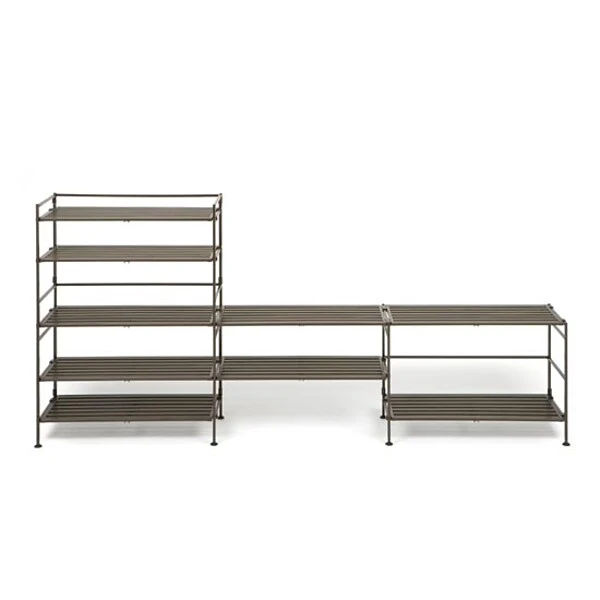 Stay organized with Seville Classics’ 3-Tier Resin Slat Utility Shoe Rack. Shelves hold approximately three pairs of shoes per tier. The shelves feature resin slats with a woodgrain texture and support up to 30 lbs. each. Frame is constructed of iron with an Espresso finish. Snap the shelves into the frame to assemble. Remove shelves and fold away for easy storage. Stack and interlock with multiple units for a personalized storage solution. No tools required for assembly. Pack includes two racks.