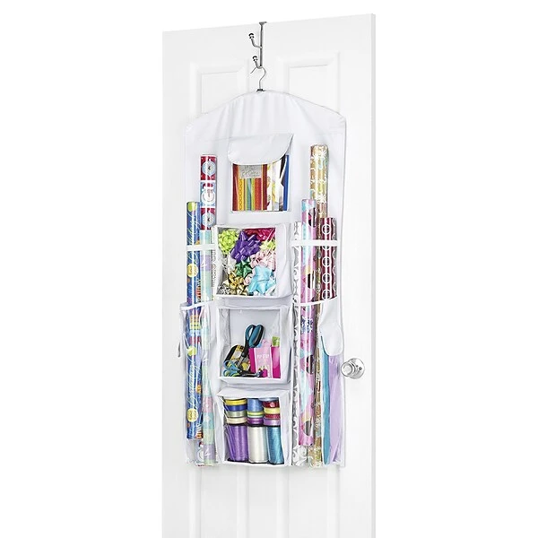 - Gift wrap organizer holds gift wrap, tissue paper, ribbon and other wrapping supplies