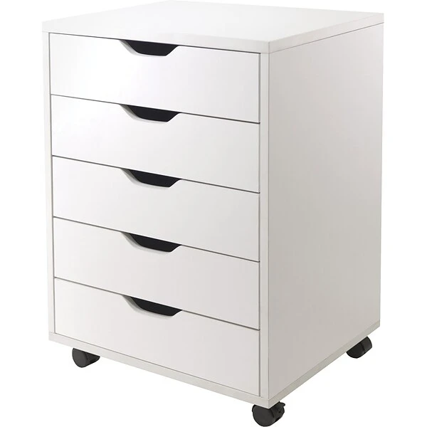 Maintain order in your craft room, office or dressing area when you store small items in this roomy, five-drawer Winsome cabinet. Crafted of composite wood with a clean, white finish, the sleek-looking cabinet includes cut-out handles that permit easy a ccess to drawer contents. Optional locking casters allow you to move the unit wherever you are working to keep the materials you need close at hand.